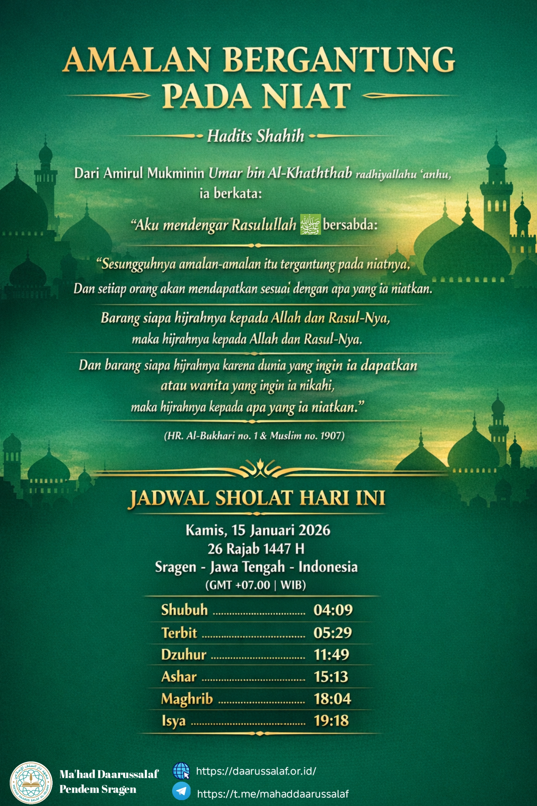 Dari Amirul Mukminin Abu Hafsh Umar bin Al Khaththab adia berkata: ‘Aku mendengar Rasulullah shalallahu alaihi wasalam bersabda: “Amalan-amalan itu hanyalah tergantung pada niatnya. Dan setiap orang itu hanyalah akan dibalas berdasarkan apa yang ia niatkan. Maka barang siapa yang hijrahnya kepada Allah dan Rasul-Nya, maka hijrahnya keapda Allah dan Rasul-Nya. Namun barang siapa yang hijrahnya untuk mendapatkan dunia atau seorang wanita yang ingin ia nikahi, maka hijrahnya kepada apa yang ia niatkan tersebut.” (Diriwayatkan oleh dua Imamnya para ahli hadits, Abu Abdillah Muhammad bin Isma’il bin Ibrahim bin Al Mughirah bin Bardizbah Al Bukhari dan Abul Husain Muslim bin Al Hajjaj bin Muslim Al Qusyairi An Naisaburi dalam dua kitab shahih mereka, yang keduanya merupakan kitab yang paling shahih diantara kitab-kitab yang ada.).[1]